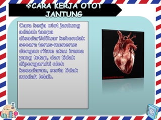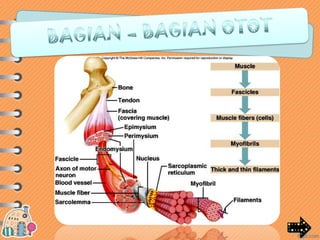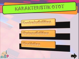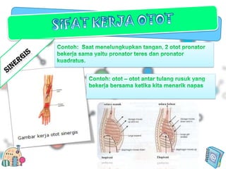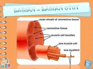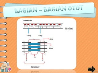 Otot lurik berfungsi untuk menggerakkan tulang dan melindungi kerangka, memiliki bentuk sel silindris dan banyak inti, serta bekerja secara sadar. Otot polos berfungsi untuk menggerakkan organ dalam tubuh, memiliki bentuk sel silindris pendek dan satu inti, serta bekerja secara tak sadar. Otot jantung hanya terdapat pada jantung dan bekerja secara otomatis dan teratur.