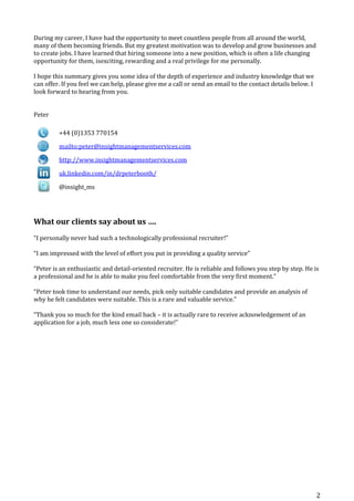 Peter Booth, PhD, is the director and founder of Insight Management Services, which specializes in recruiting talent for the scientific and technical instrumentation sector. With over 27 years of experience in the industry, Booth has developed expertise in sales, marketing, and global business strategies. He emphasizes the importance of understanding clients' needs and finding exceptional candidates to enhance business performance.