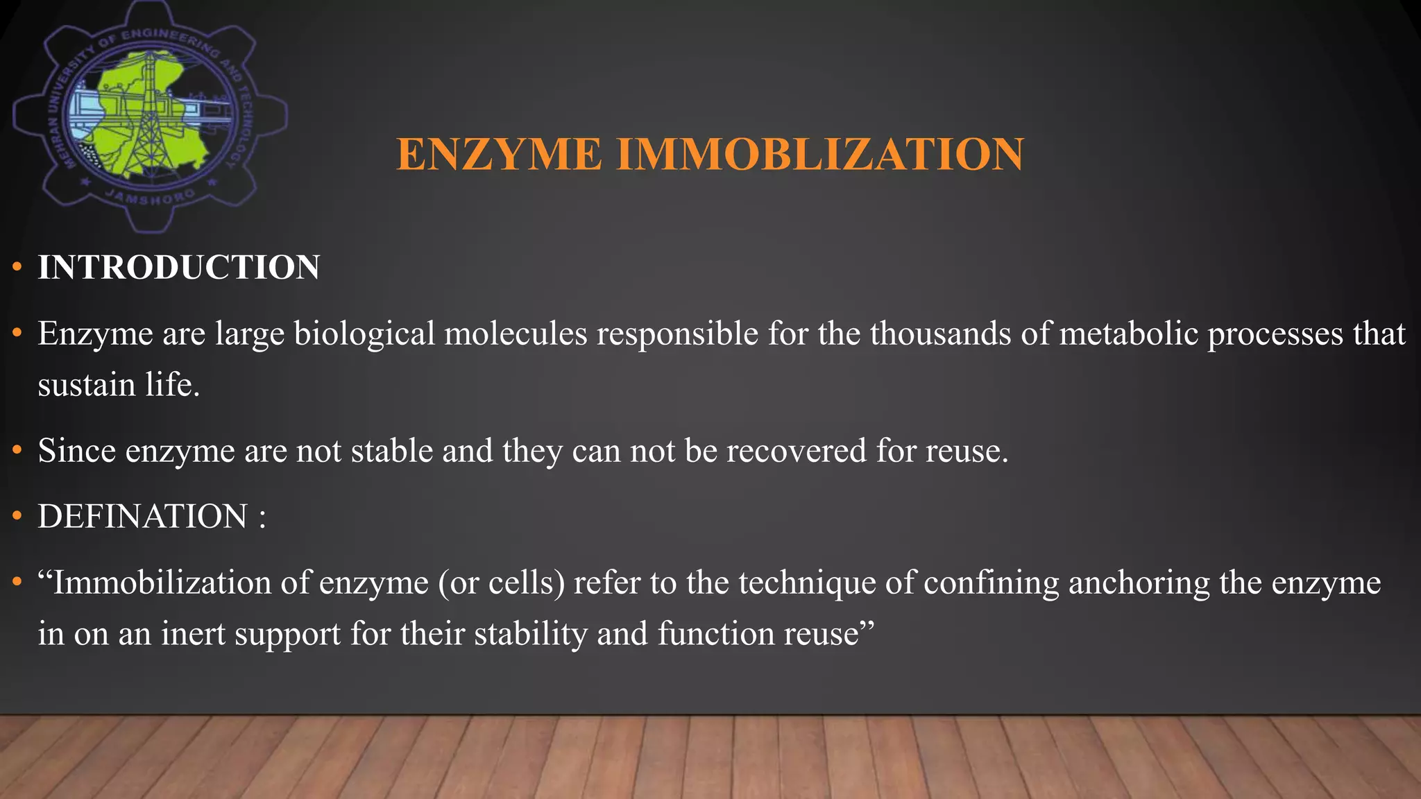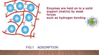 Enzymes can be immobilized to support structures using various techniques. This confines and anchors the enzymes, making them stable and reusable. The main immobilization techniques are adsorption, entrapment, covalent binding, and cross-linking. Adsorption uses weak bonds to attach enzymes to inert supports, but the bonding is weak. Covalent binding and cross-linking form stronger covalent bonds or cross-links between enzymes and supports or between enzyme molecules. Immobilization can impact enzyme properties and kinetics but allows for reuse of enzymes in industrial, analytical, and therapeutic applications.