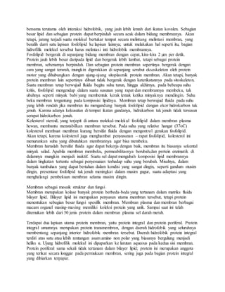 Dokumen ini menjelaskan struktur dan fungsi membran sel, yang terdiri dari lapisan lipid dan protein, serta peran karbohidrat dalam pengenalan sel. Membran berfungsi sebagai penghalang selektif, memungkinkan molekul tertentu untuk berlalu dan terlibat dalam proses transportasi, transduksi sinyal, dan perlindungan sel. Selain itu, perilaku fluida membran diatur oleh komposisi lipid dan keberadaan kolesterol, mempengaruhi permeabilitas dan reaktivitas membran terhadap lingkungan.