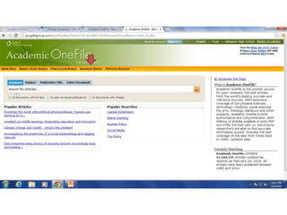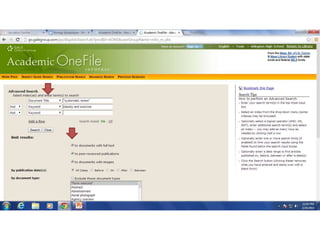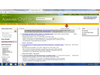 This document provides guidance on finding and using peer-reviewed scholarly sources for a biology symposium. It defines peer-reviewed sources as articles written and evaluated by experts in a field. It recommends searching specialized library databases and using advanced search filters to find peer-reviewed articles. The document provides tips for effective keyword searching and sample searches on the topic of diet versus exercise. Finally, it offers advice on reading scholarly articles, including reading background information first and focusing on key sections like the abstract and discussion.