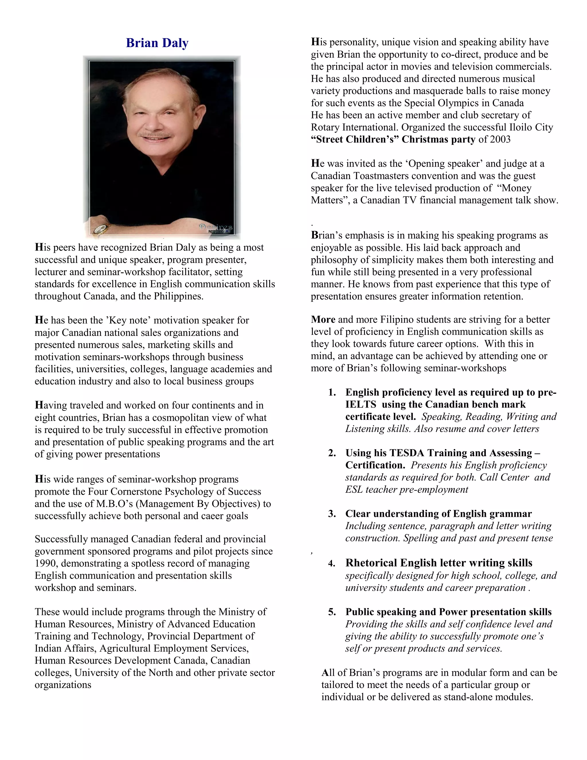 Brian Daly is an experienced speaker, lecturer, and seminar facilitator who has worked in Canada, the Philippines, and other countries. He specializes in teaching English communication skills and has successfully managed government programs focused on public speaking, presentation skills, and career development. Brian tailors his workshops and seminars to help participants improve their English proficiency, grammar, writing, and public speaking abilities. His engaging teaching style aims to make learning enjoyable while still being professional.