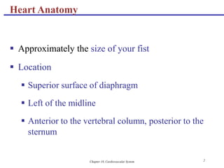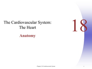 The document describes the anatomy and physiology of the cardiovascular system, with a focus on the heart. It discusses the internal and external structures of the heart, including its coverings, chambers, valves, vessels and blood supply. It also explains the cardiac cycle, electrical conduction system, heart sounds, and how the heart pumps blood through the lungs and body in a continuous loop. The document contains diagrams labeling the various parts of the heart and depicting the flow of blood and electrical impulses.