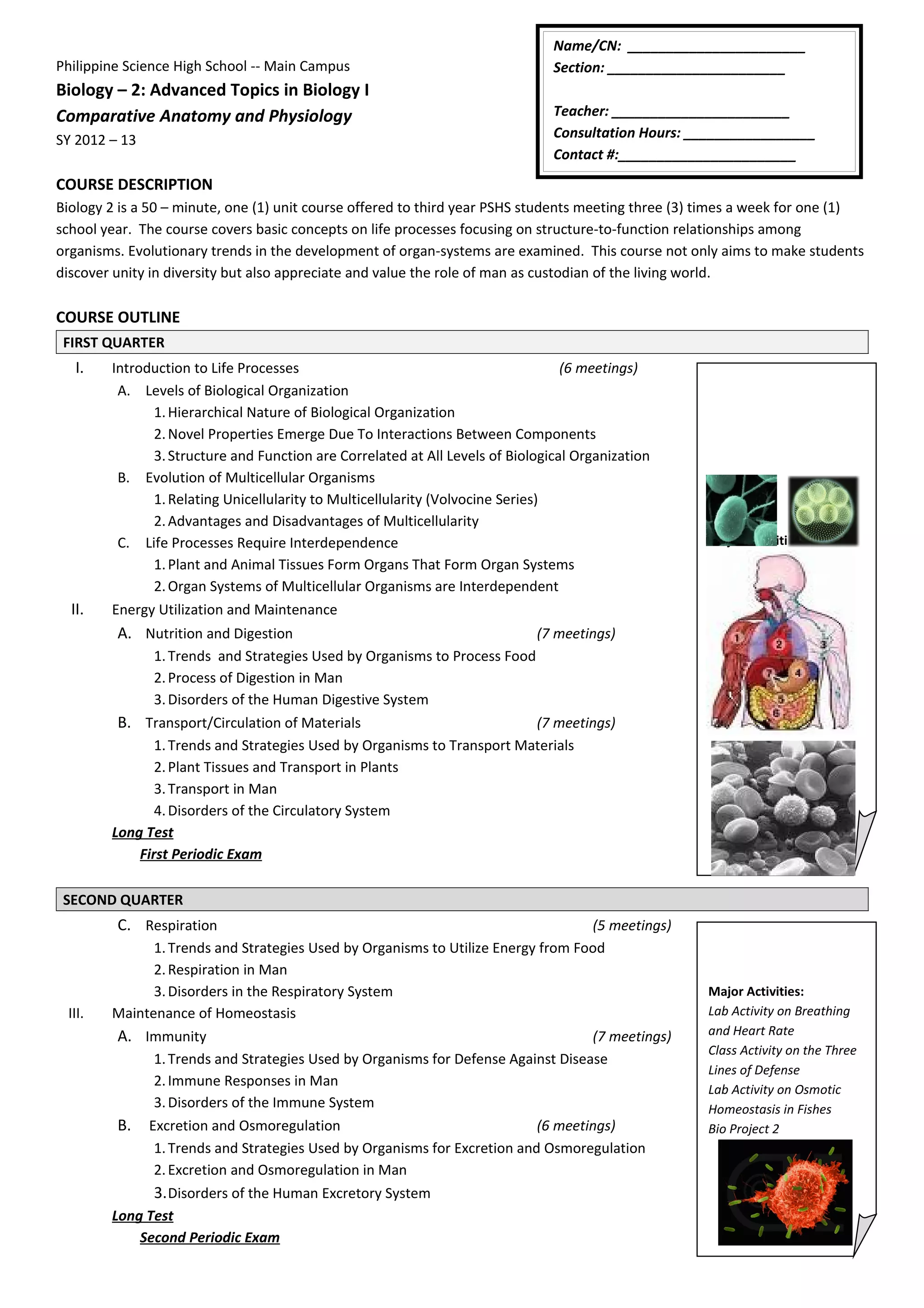 This document outlines the course description, course outline, references, and grading system for Biology 2, a one unit comparative anatomy and physiology course offered to third year students at the Philippine Science High School - Main Campus. The course covers basic concepts of life processes with a focus on structure-function relationships among organisms. It examines evolutionary trends in organ system development. The course aims to demonstrate unity in diversity and value nature. It is divided into four quarters covering topics like biological organization, life processes, homeostasis, support/locomotion, regulation/control, and reproduction. Student work is evaluated based on tests, exams, class activities, and participation.