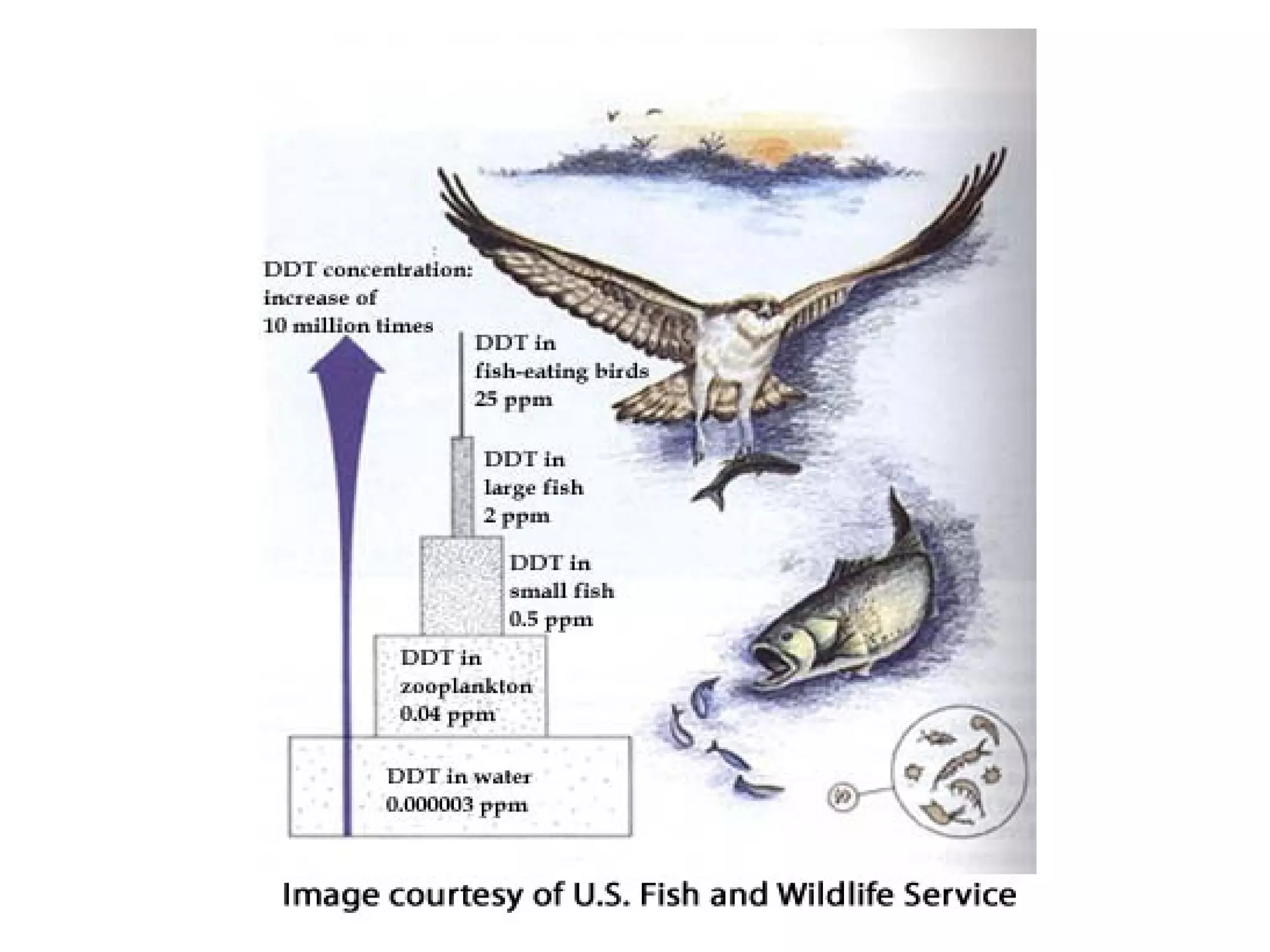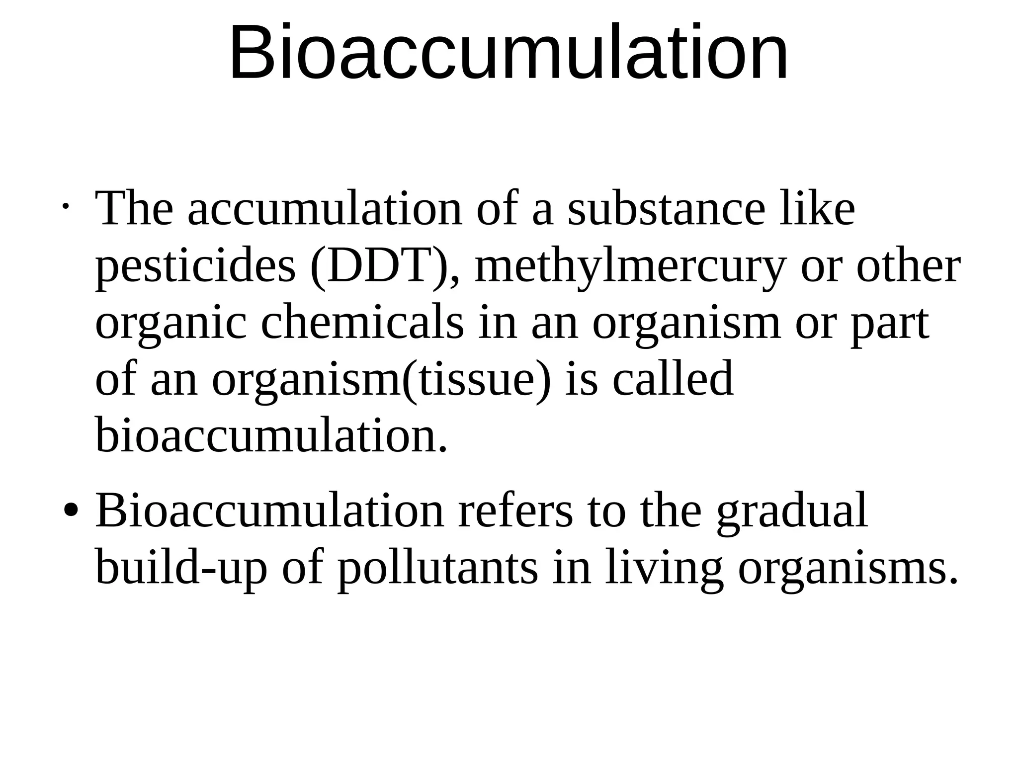 Bioaccumulation and biomagnification refer to the increasing concentration of pollutants like pesticides, mercury, and other chemicals as they move up the food chain. Bioaccumulation is when an organism absorbs more of a substance than it eliminates, resulting in increasing concentration over time. Biomagnification occurs when concentrations increase at each trophic level, so organisms at the top of food chains face greater exposure. Pollutants like DDT, PCBs, and mercury are especially prone to bioaccumulation and biomagnification due to their persistence and ability to concentrate in fatty tissues. This can negatively impact wildlife and pose risks to human health through consumption of contaminated fish and seafood.