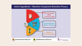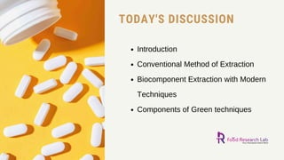This document summarizes different techniques for extracting bioactive components from plants, including conventional methods like Soxhlet extraction and maceration as well as modern green techniques. Some key modern techniques discussed are microwave assisted extraction, ultrasound assisted extraction, supercritical fluid extraction using carbon dioxide, and deep eutectic solvent extraction. These green techniques have advantages over conventional methods like faster extraction rates, more effective energy use, reduced equipment needs, and preservation of bioactive compounds. The document provides details on how each technique works and its advantages.
