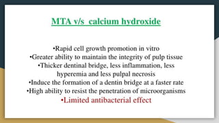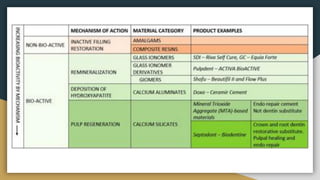 The document discusses the use of bioactive materials in dentistry, highlighting their capabilities to remineralize dental structures and regenerate live tissue. It emphasizes the importance of materials like glass ionomer cements, giomers, calcium silicates, and mineral trioxide aggregate (MTA) in improving clinical outcomes and the longevity of dental restorations. The use of bioactive endodontic sealers marks a shift in dental practice towards biologically active materials that bond with teeth and support tissue regeneration.
