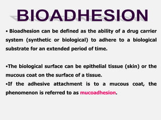 This document discusses the principles and mechanisms of bioadhesion and mucoadhesion for drug delivery systems, outlining how hydrophilic matrices like hydrogels can enhance drug contact time and localization at target sites. Various factors influencing bioadhesion, including polymer characteristics and the nature of biological substrates, are highlighted along with their implications for drug delivery via mucosal surfaces. The document also details methods for evaluating bioadhesive properties and applications in different delivery routes like buccal, gastric, and intestinal systems.