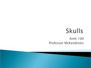 The document discusses several anatomical indicators that paleoanthropologists use to study skulls and determine aspects of an animal's biology, such as brain capacity, diet, and whether it was bipedal or quadrupedal. These indicators include the saggital crest, brow ridge, foramen magnum, eye position, occipital bun, zygomatic arch, jaw shape, chin, jaw robustness, teeth, muscle voids, and skull shape. Images are provided comparing human, gorilla, chimp, and dog skulls to demonstrate differences in these anatomical features.