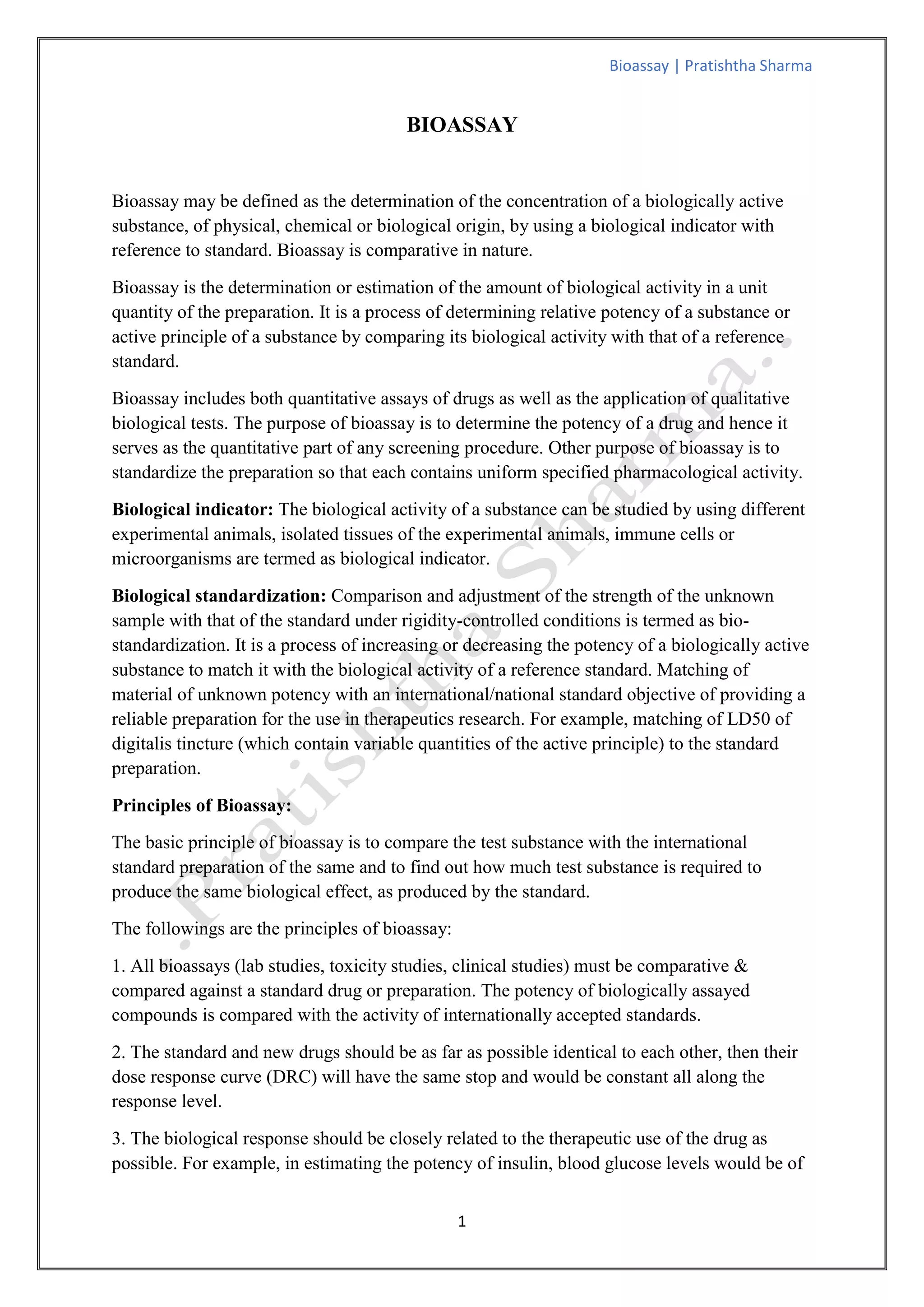 Bioassay is defined as the determination of the concentration of a biologically active substance by using a biological indicator in reference to a standard. It involves comparing the biological activity of a test substance to a reference standard. There are two main types of bioassays - quantal bioassays, which measure an all-or-nothing response, and graded bioassays, which measure a response proportional to dose. Bioassays are used to standardize drugs, determine potency, and estimate doses needed for therapeutic or toxic responses.