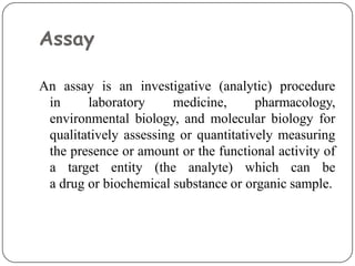 Dr. Gurumeet C Wadhawa discusses biological assays. An assay is a procedure used to qualitatively or quantitatively assess the presence, amount, or functional activity of a target entity. There are three main types of assays: chemical, immuno, and bioassays. Bioassays involve estimating the concentration or potency of a pharmaceutical drug using animal or human subjects. While less precise than chemical assays, bioassays are more sensitive and can be used when chemical methods are not available or applicable. Bioassays are used to standardize and quantify various biological substances and products.