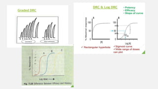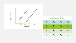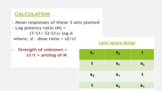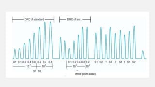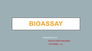 This document provides an overview of bioassay, which is defined as the comparative assessment of the potency of a test compound relative to a standard compound based on their effects on living tissue. It discusses the objectives, principles, types of errors, important criteria, and applications of bioassays. Various types of bioassays are described including direct endpoint assays, quantal assays, and graded assays such as bracketing, matching, interpolation, and multiple point (3-point, 4-point, 6-point) assays. The document explains the procedures, calculations, and importance of different bioassay methods.