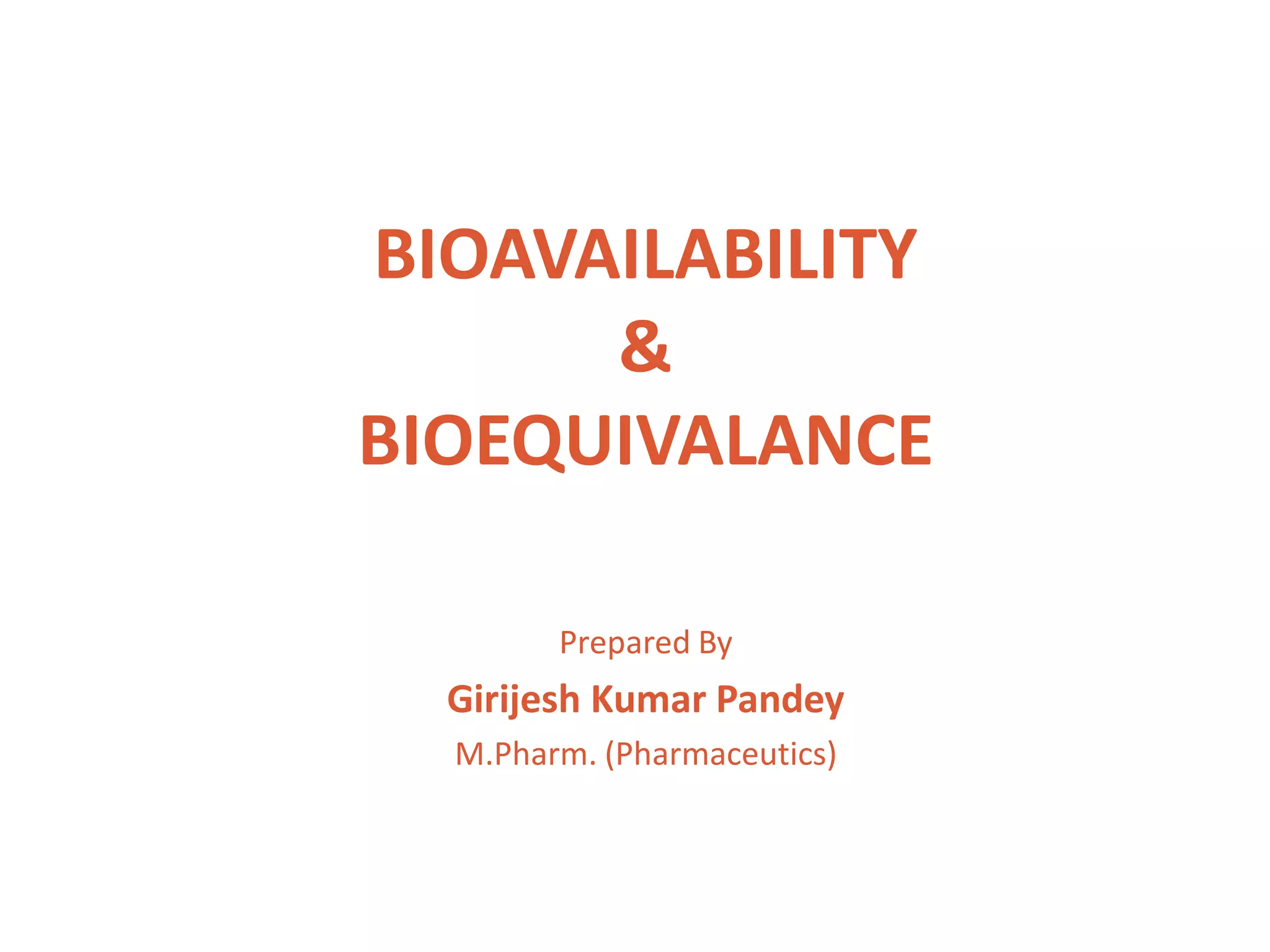 This document discusses bioavailability and bioequivalence. It defines bioavailability as the rate and extent of drug absorption into systemic circulation from its dosage form. Bioequivalence is established when two similar dosage forms reach systemic circulation at the same relative rate and extent. The objectives, significance, and various study designs of bioavailability testing are described, including absolute vs relative bioavailability. Methods for measuring bioavailability and various in vitro drug dissolution models are also summarized.