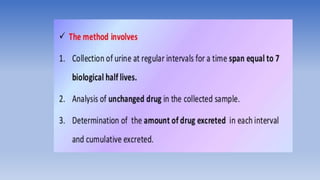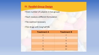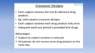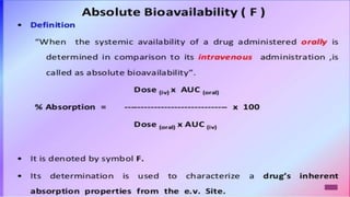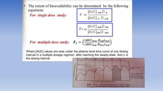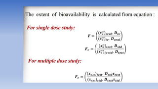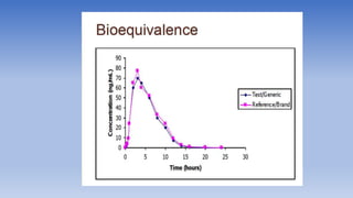 The document discusses bioavailability and bioequivalence, focusing on the extent and rate at which a drug enters systemic circulation and the importance of ensuring that the delivered dose is effective. It outlines objectives for bioavailability studies, methods for improvement, and different assessment techniques, including pharmacokinetic and pharmacodynamic methods. Additionally, it covers in vitro dissolution testing and the conditions under which bioequivalence can be established, particularly regarding generic drugs.