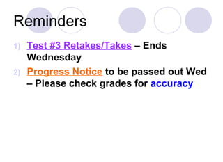2) Reminders about upcoming tests and progress notices.