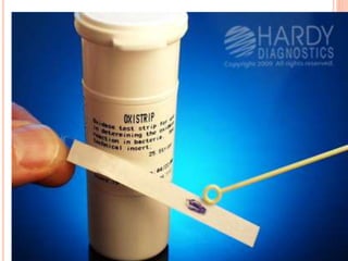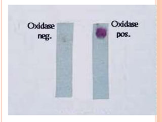 The document describes the oxidase test, which is used to identify bacteria. It works by detecting cytochrome c, an iron-containing protein in the respiratory chain, which causes an oxidase reagent to turn purple in oxidase-positive bacteria within 5-10 seconds. The document outlines several methods for performing the test, such as using filter paper or commercial strips soaked in reagents like tetramethyl-p-phenylenediamine. It lists both oxidase-positive and -negative bacteria and notes the test is useful for bacterial classification. Modifications to the standard method are presented to more rapidly and accurately detect weakly oxidase-positive organisms.