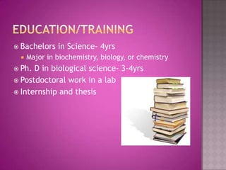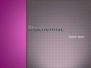 Caitlin Ward is a biochemist who researches human diseases and develops new drugs and treatments. Her education includes a bachelor's degree in biochemistry, biology or chemistry, as well as a Ph.D. in biological science. As a biochemist, she performs tasks like weighing chemicals, filtering liquids, and growing microorganism cultures in a lab setting using tools such as test tubes, beakers, and electron microscopes. Her work involves running trials, analyzing data, and developing conclusions and new drugs based on her research findings.