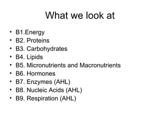 The document provides an overview of key topics in biochemistry including energy from food, proteins, carbohydrates, lipids, and nucleic acids. Specifically, it discusses how calorimetry can be used to determine the energy content of foods, the structures and functions of amino acids, proteins, carbohydrates like glucose and starch, and lipid molecules like triglycerides. It also briefly outlines analysis techniques for proteins like chromatography and electrophoresis. The document serves as an introductory guide to understanding the basic building blocks and energy sources in living organisms.
