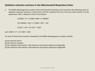 The document provides a detailed analysis of oxidation-reduction reactions occurring in the mitochondrial respiratory chain, emphasizing the role of NADH and FAD as electron carriers. It discusses the conditions affecting the oxidation states of carriers and the effects of inhibitors like potassium cyanide. Additionally, it covers biochemical processes related to fatty acid oxidation and photosynthesis, including the engineering of plants to emit infrared light and the implications on their metabolic functions.