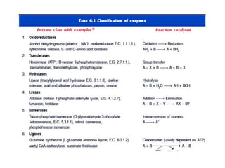 This document discusses the chemistry and classification of enzymes. It describes the structure of enzymes including their active site, which binds substrates and contains residues that help hold substrates. The active site can be divided into binding and catalytic sites. Co-factors, which can be inorganic or organic, are also required for proper enzyme activity. Enzymes are classified according to the reaction they catalyze and given EC numbers based on their class, subclass, etc. The classes are oxidoreductases, transferases, hydrolases, lyases, isomerases, and ligases.