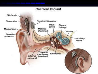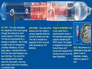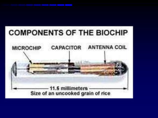 Biochip is a microprocessor chip that combines biology, electronics, and computer science. It allows many tests to be done by arranging microarrays on a solid substrate. Biochips were first developed in 1983 for monitoring fisheries and major development began in 1990. The biochip system uses radio frequency identification to communicate between an implanted transponder and external reader. Biochips can be used for identification purposes, medical monitoring of conditions like cancer and glucose levels, and restoring functions like sight and hearing.