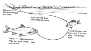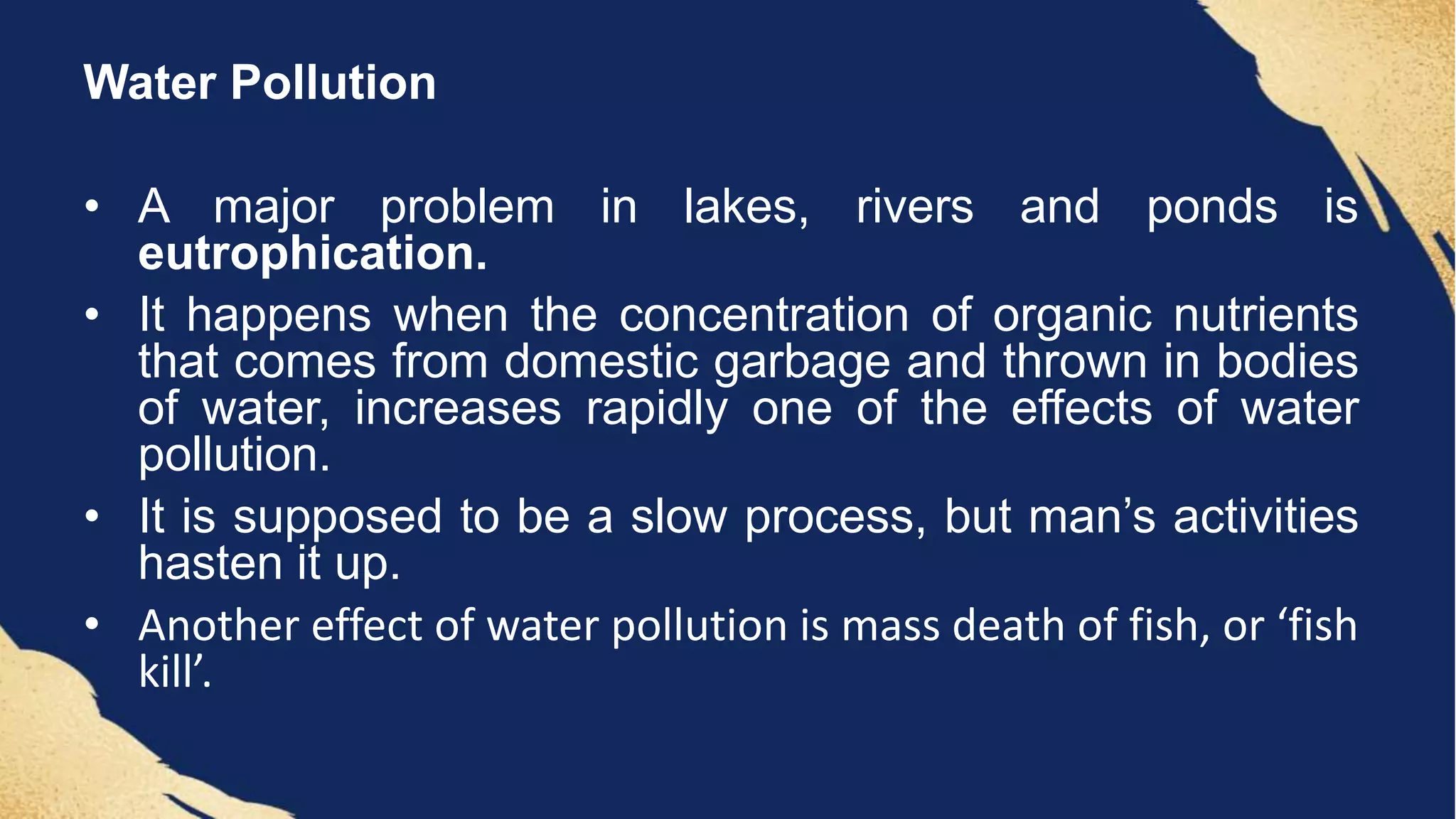 Water pollution causes eutrophication and fish kills. Eutrophication occurs when excess nutrients from domestic waste enter bodies of water, promoting algal blooms and depleting oxygen levels. Fish kills happen when algae die off uses up oxygen, killing aquatic animals. Toxins like PCBs also build up in food chains, concentrating in organisms and fish tissues.
