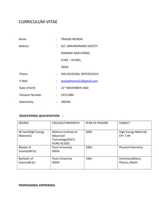 Prasad Menon has over 30 years of experience working with energetic materials and explosives at the High Energy Materials Research Laboratory in India. He has a M.Tech in High Energy Materials and B.Sc degrees in chemistry, physics, and math. His experience includes developing and producing explosives like dense nitrocellulose, HMX, TATB, and FOX-7. He has trained personnel and given lectures on properties and safety of energetic materials. Menon is looking for a position that offers a competitive salary commensurate with his extensive experience in the field of energetic materials research and production.