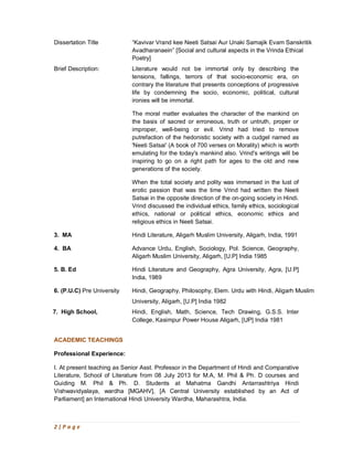 This curriculum vitae summarizes the educational and professional qualifications of Dr. Umesh Kumar Singh. It outlines his academic background, including obtaining a PhD in Hindi literature from Jawaharlal Nehru University. It also lists his professional experience teaching Hindi literature at various universities in India and abroad. Finally, it provides an overview of his published works, including authored books, research articles, and roles editing magazines related to Hindi literature.