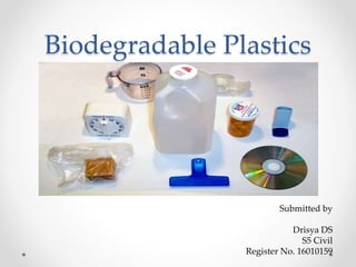 This document provides information about biodegradable plastics, including their types, manufacturing processes, and potential uses. It discusses how biodegradable plastics like directly-expanded starch products and starch-polymer blends are made. The document also outlines the advantages of biodegradable plastics like being renewable and reducing dependence on oil, as well as potential disadvantages like the conditions needed for degradation and effects on soil and water quality. It provides examples of where biodegradable plastics can be found for sale online.