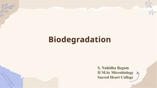 Biodegradation is the breakdown of organic matter by microorganisms into simpler substances, primarily through aerobic and anaerobic processes. Various microorganisms, such as bacteria and fungi, facilitate this process, which is influenced by factors like nutrient availability and environmental conditions. While essential for waste management and sustainability, biodegradation faces challenges including slow rates and potential toxic byproducts.