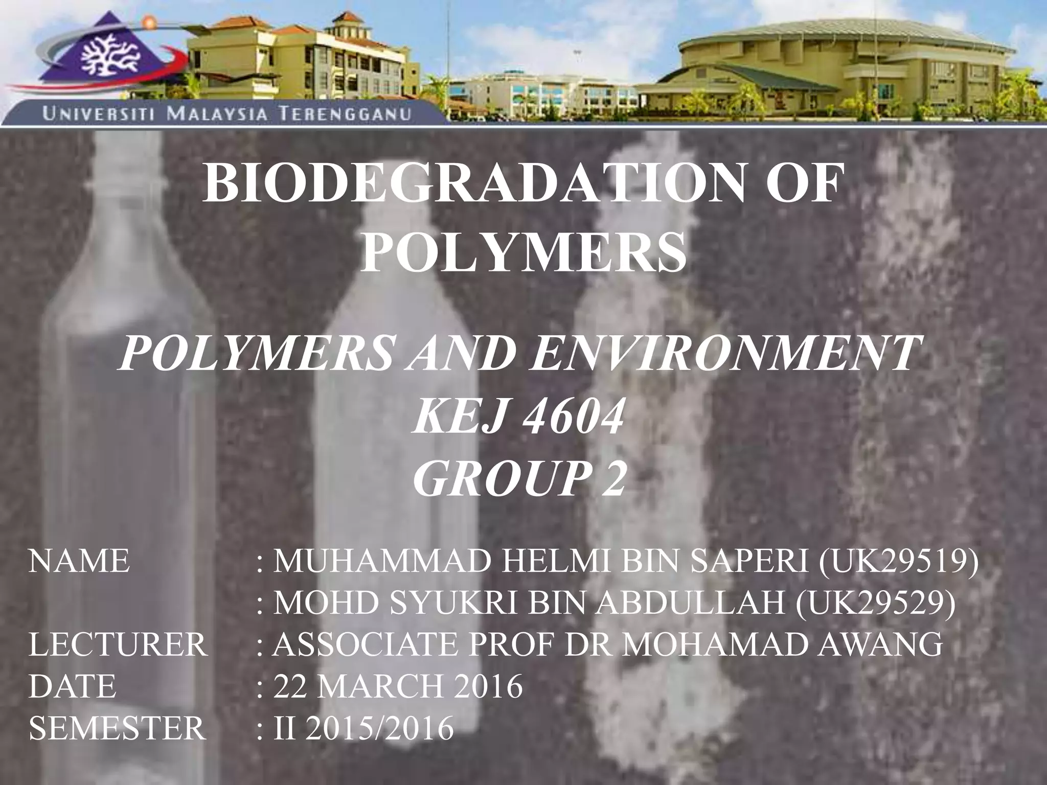 This document provides an overview of biodegradation of polymers. It begins with definitions of key terms like biodegradable polymer and discusses various factors that affect biodegradation like chemical structure, morphology, and physical properties. It then classifies polymers as natural or synthetic and lists examples of commonly used biodegradable polymers like poly(lactic acid), poly(glycolic acid), and poly(caprolactone). The mechanisms of biodegradation and bioerosion are described. Applications of biodegradable polymers in medical devices and advantages of using biodegradable polymers are highlighted. The document concludes with a glossary of terms.