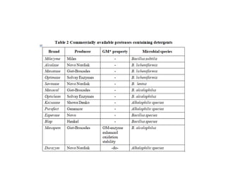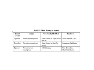 The document discusses the importance of cleaning agents in the dairy and food industry, highlighting the shortcomings of synthetic detergents, particularly in removing milk stones and their environmental impact. Enzyme-based detergents are emerging as a more effective and eco-friendly alternative, exhibiting greater efficiency and biodegradability. The document emphasizes the need for advanced cleaning solutions to address challenges like membrane fouling and biofilm formation in food processing environments.