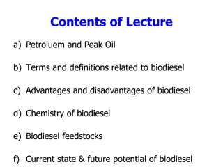 The document presents an overview of biodiesel, covering its production, benefits, and challenges. It highlights biodiesel as a renewable fuel alternative to diesel, with advantages including lower emissions and support for local economies, while also noting disadvantages like lower energy content and cold weather performance issues. The emphasis is on the importance of sustainable practices and advancements in production methods for the future of biodiesel.