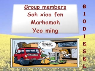 1) Biodiesel is made from vegetable oils or animal fats through a process called transesterification. It can be used in many vehicles and applications as a replacement for or blended with petroleum diesel.