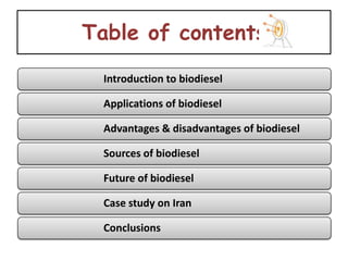This document discusses biodiesel, including its history, definition, applications, advantages, disadvantages, and future potential. It provides a case study on using microalgae for biodiesel production in Iran. The key points are: