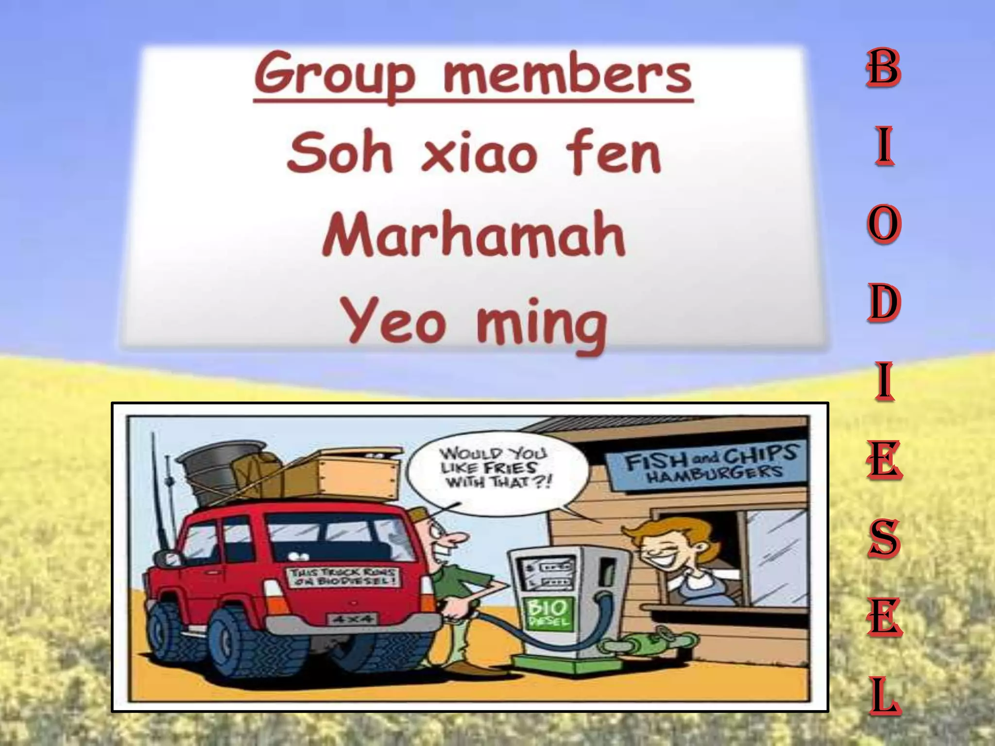 This document provides an overview of biodiesel, including its history, definition, applications, advantages, disadvantages, and future potential. It discusses biodiesel being made from vegetable oils or animal fats through a process called trans-esterification. Applications include use in vehicles, generators, and marine vessels. Advantages include being renewable and less polluting, while disadvantages include higher costs. The future of biodiesel is seen to lie in genetically engineered microalgae which can potentially be used to completely replace petroleum-derived diesel fuels. The document also presents a case study on Iran and how microalgae cultivation could help meet its future biofuel needs.