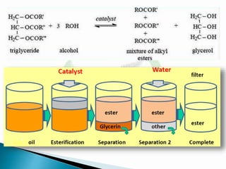 Biodiesel is a renewable fuel made through a chemical process called transesterification, where vegetable oils or animal fats react with alcohol in the presence of a catalyst to produce fatty acid alkyl esters. It can be used in diesel engines as a substitute for or additive to petroleum diesel. Biodiesel production has environmental benefits like reducing greenhouse gas emissions and promoting rural development through job creation. However, there are also constraints like higher fuel consumption and potential impacts on food security if feedstocks compete with crops for land.
