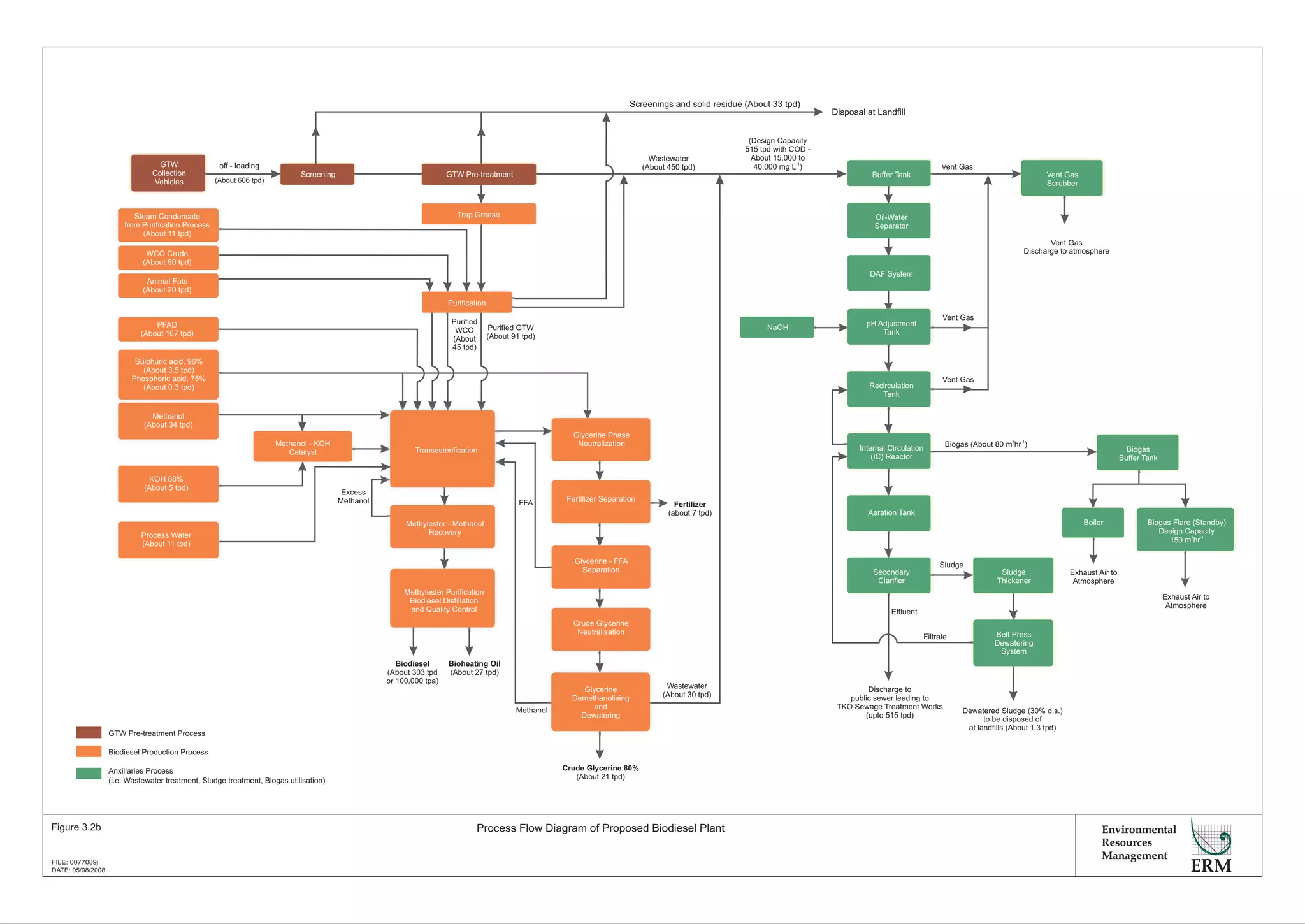 The document is a process flow diagram for a proposed biodiesel plant. Raw materials like waste cooking oil, animal fats and processed fatty acid distillate are pre-treated and purified. They are then processed using a transesterification reaction with methanol and KOH catalyst to produce biodiesel and glycerine. The biodiesel undergoes further purification and quality control. Byproducts like glycerine and fertilizers are also produced. Effluents are treated in wastewater and sludge treatment systems before being discharged.