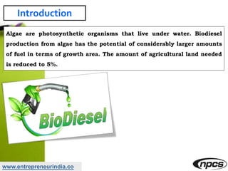 The document discusses the potential of biodiesel production from algae, highlighting its advantages as a renewable fuel that can reduce pollution and blend with conventional diesel without major modifications. It outlines the positive market outlook for biodiesel, driven by global environmental concerns and regulatory support in various countries, projecting significant growth in the sector. The report also addresses the production process, market dynamics, and challenges such as raw material availability and installation costs.