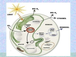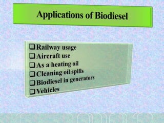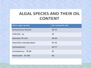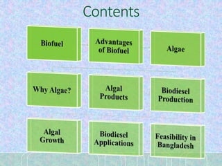 Algae can be used to produce biodiesel through a multi-step process. Algae grow rapidly and can be harvested for their oil, which can then be extracted and treated through transesterification to produce biodiesel. This biodiesel production from algae has advantages over fossil fuels as algae are renewable and do not compete with food sources. Open ponds and closed photobioreactor systems can be used to cultivate the algae. Bangladesh's climate and available resources make it suitable for large-scale algae cultivation and biodiesel production.