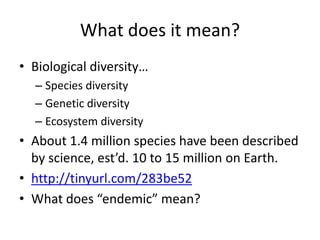 Biodiversity refers to the variety of species, genetic diversity, and ecosystems on Earth. There are estimated to be 10-15 million species but only 1.4 million have been identified. Major extinction events have occurred throughout history, with the most recent one 65 million years ago wiping out 75% of species including dinosaurs. Today, 20% of vertebrates are threatened with extinction due to human impacts like habitat destruction, invasive species, pollution, overconsumption, and population growth. Island species are especially vulnerable. Conservation efforts aim to preserve biodiversity through protecting endangered species and their habitats.