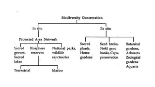 This document discusses biodiversity and its importance. It defines biodiversity as the variety of life on Earth, including species diversity, genetic diversity within species, and ecosystem diversity. It notes that biodiversity is essential for human life as it provides food, medicine, and industrial products. Biodiversity also plays important economic and ecological roles by supporting agriculture, forestry, and ecosystem services like clean air and water. The loss of biodiversity has serious costs. The document then classifies biodiversity into genetic, species, and ecosystem diversity and provides examples of each.