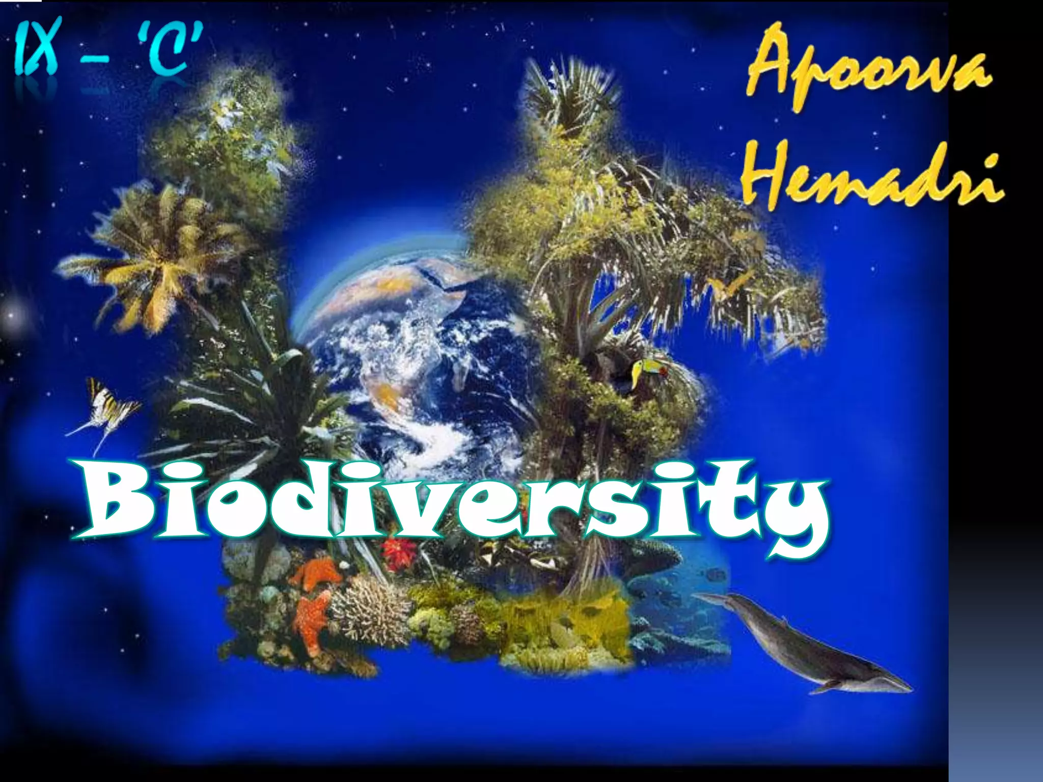 Biodiversity refers to the variety of life on Earth, including genetic, species, and ecosystem diversity. There are six kingdoms of life - Archaea, Bacteria, Protista, Fungi, Plantae, and Animalia. Species diversity is estimated between 2-100 million species globally, though only 1.4 million have been named. Genetic diversity refers to variation between individuals of the same species. Ecosystem diversity measures communities of plants and animals and their physical environment. Protecting biodiversity requires conserving ecological processes and maintaining reserves large enough to support complex species interactions.