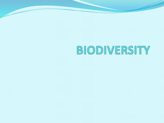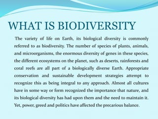 Biodiversity refers to the variety of life on Earth, including the number of plant and animal species, the genetic diversity within them, and the different ecosystems they inhabit. The major threats to biodiversity are the destruction and fragmentation of habitats, pollution, introduction of exotic species, and overexploitation. These can be addressed by protecting natural areas, preventing invasive species, educating people, slowing climate change, and promoting sustainable practices in areas like agriculture, fishing, urban planning, and policymaking. Conservation of biodiversity is important for ecosystem functioning and provides many services that humanity depends on.