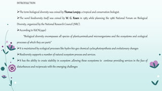 This document discusses biodiversity hotspots around the world. It defines biodiversity and explains that hotspots are regions with high biodiversity that are threatened by habitat loss. There are 34 global biodiversity hotspots scattered across North and South America, Europe/Central Asia, Africa, and Asia-Pacific. Three hotspots are found in India - Indo-Burma, the Himalayas, and the Western Ghats-Sri Lanka. These regions contain thousands of endemic plant and animal species, many of which are threatened. The document provides examples of newly discovered and endangered species found within India's biodiversity hotspots.