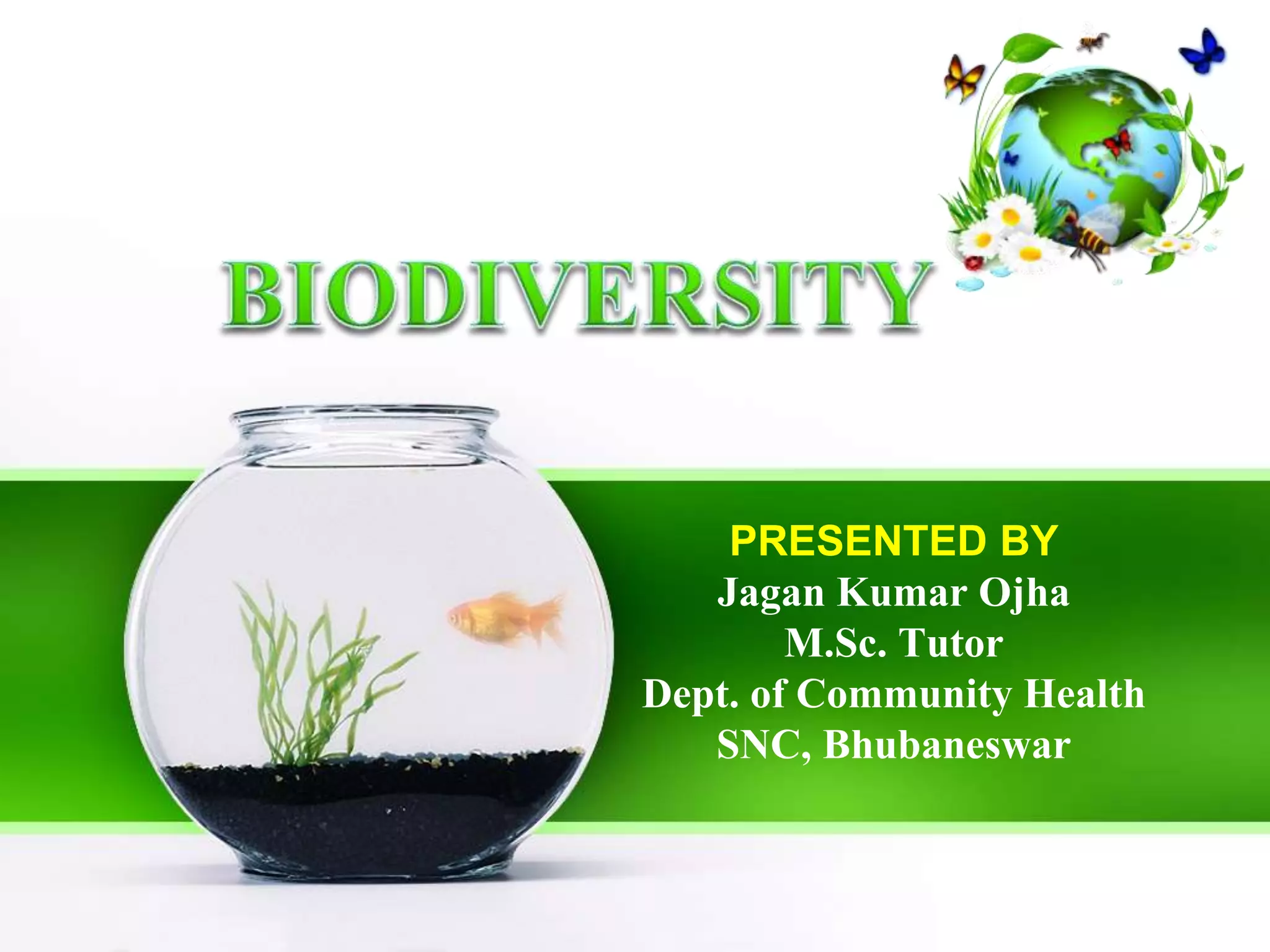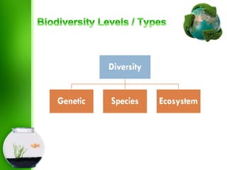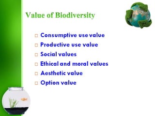 This document discusses biodiversity and its importance. It defines biodiversity as the variety of life on Earth, including all species of plants, animals and microorganisms, as well as the genetic variation within each species and the ecosystems in which they live. It then discusses different types of biodiversity, including genetic diversity, species diversity and ecosystem diversity. The document also outlines several values of biodiversity, such as consumptive use value, productive use value, social value, ethical/moral value, aesthetic value, and option value. Maintaining biodiversity is important for ecological processes, human health, agriculture and industry.