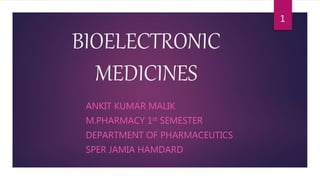 Bioelectronic medicine uses principles of electronics, biology, and neuroscience to develop technologies that can diagnose diseases and regulate biological processes through nerve stimulation and sensing. This includes using implanted devices powered by the body that can replace organ functions like pacemakers for the heart or provide prosthetics for limbs. Applications also include biosensors that can monitor things like body temperature, stress, and movement to provide health and performance data. The field holds promise for new treatments for conditions like heart disease by providing electrical alternatives to drugs or surgery.