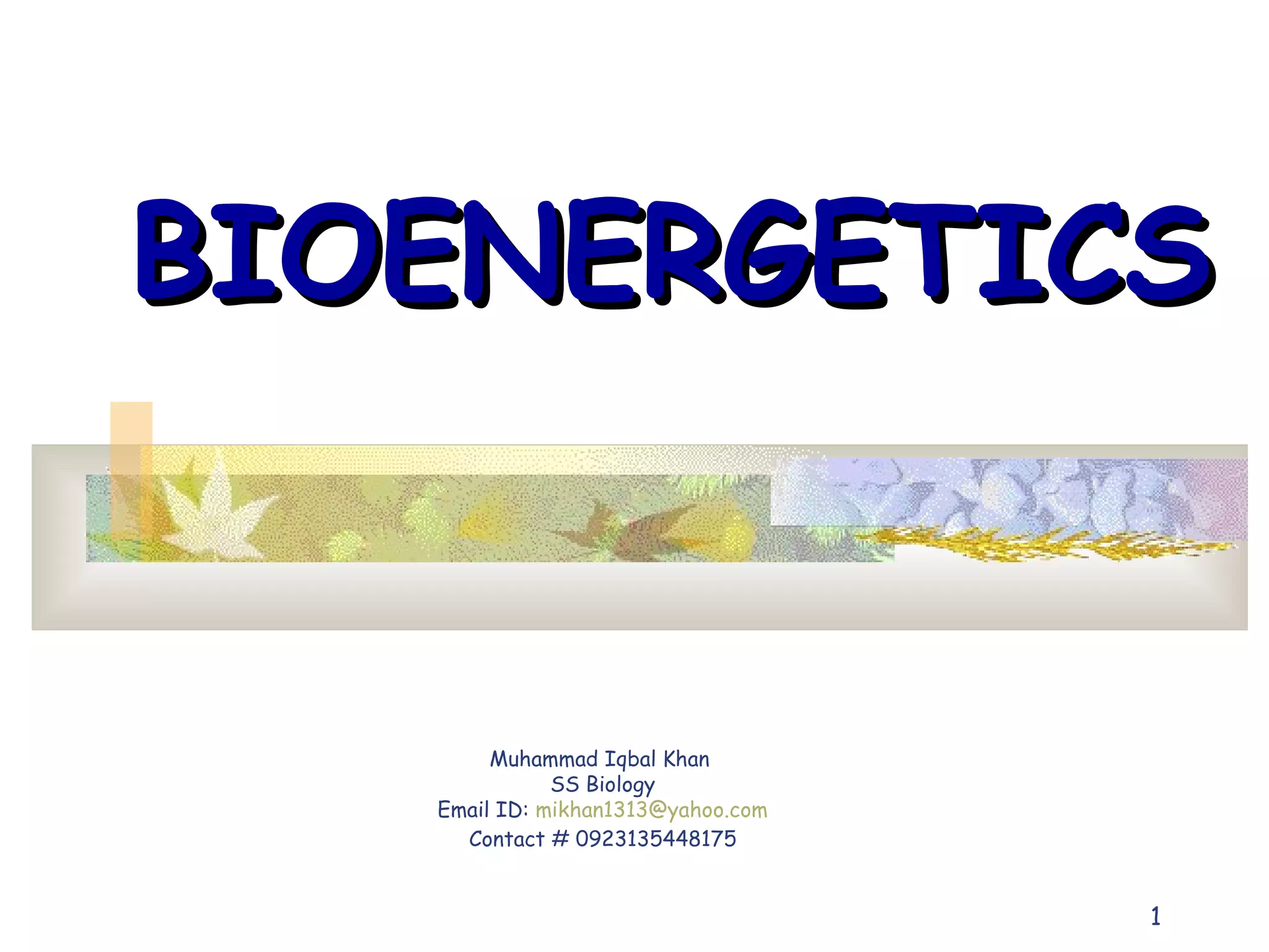 The document provides an overview of bioenergetics, focusing on the study of energy in living organisms and the types of energy involved, including kinetic and potential energy. It explains metabolic reactions such as endergonic and exergonic reactions, highlighting processes like photosynthesis and cellular respiration, and discusses the role of ATP in energy transfer within cells. Additionally, it details how ATP is synthesized and broken down through phosphorylation and hydrolysis, respectively.
