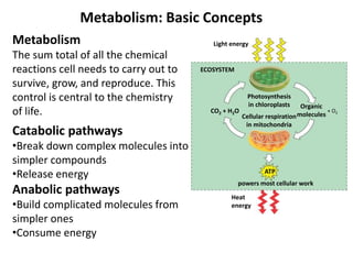 The document discusses key concepts in metabolism including photosynthesis, cellular respiration, ATP, and free energy. Photosynthesis uses light energy to convert CO2 and H2O into organic molecules and oxygen. Cellular respiration in mitochondria converts organic molecules back into CO2 and uses the energy released to produce ATP, which powers most cellular work. Metabolic pathways are classified as either catabolic, which breaks down molecules and releases energy, or anabolic, which builds molecules and requires energy. ATP acts as the main energy carrier in cells by coupling exergonic reactions to endergonic reactions like chemical work, transport work, and mechanical work.