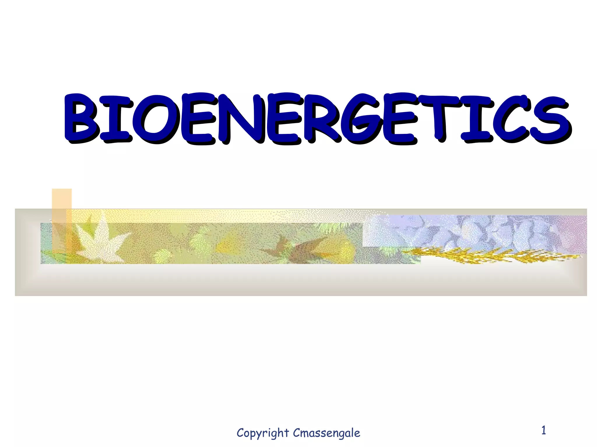 Bioenergetics is the study of energy in living systems and organisms. ATP (adenosine triphosphate) is the main energy carrier in cells. It contains high-energy phosphate bonds that are broken to release energy for cellular work through the hydrolysis of ATP. This exergonic reaction is coupled to endergonic cellular processes like biosynthesis through phosphorylation, transferring a phosphate group and restoring the chemical bonds in ATP.